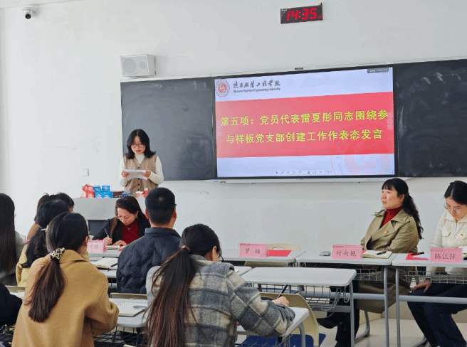 最后,党员代表雷夏彤同志作表态发言,围绕如何积极参与和投身样板党支部创建工作,结合自身工作实际,分享了对样板党支部创建的认识和理解,并表示将以高度的责任感和使命感,积极发挥党员先锋模范作用,在理论学习、教学科研、服务师生等方面作表率,为样板党支部创建贡献自己的力量。