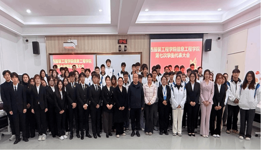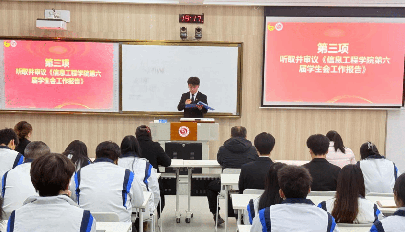 为深入学习贯彻习近平新时代中国特色社会主义思想,落实立德树人根本任务,凝聚青年学生奋进力量,2025年11月19日信息工程学院第七次学生代表大会在B208教室顺利召开。会前,大会预备会议上严格按程序完成各项工作,审议并通过了本次大会的议程、学生会主席团名单、代表资格审查报告等,为正式会议的规范有序召开奠定了坚实基础。信息工程学院党委副书记兼学工办主任罗雄,团委书记崔燕,团委副书记任甜甜,第一党支部书记王蒙以及70余名学生代表参加了本次大会。