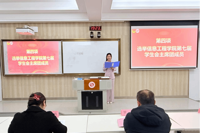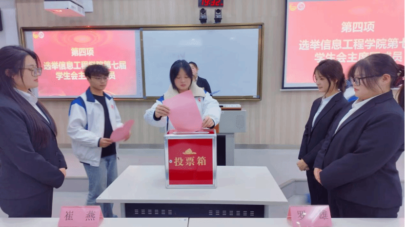 随后,大会严格遵循民主选举程序与相关规定,进入核心选举环节。由信息工程学院学生会组宣部成员周佳怡同学宣读选举办法。全体学生代表秉持公平、公正、公开原则,认真履行民主权利,通过规范流程选举产生信息工程学院第七届学生会主席团成员及参加校级学代会的学生代表。