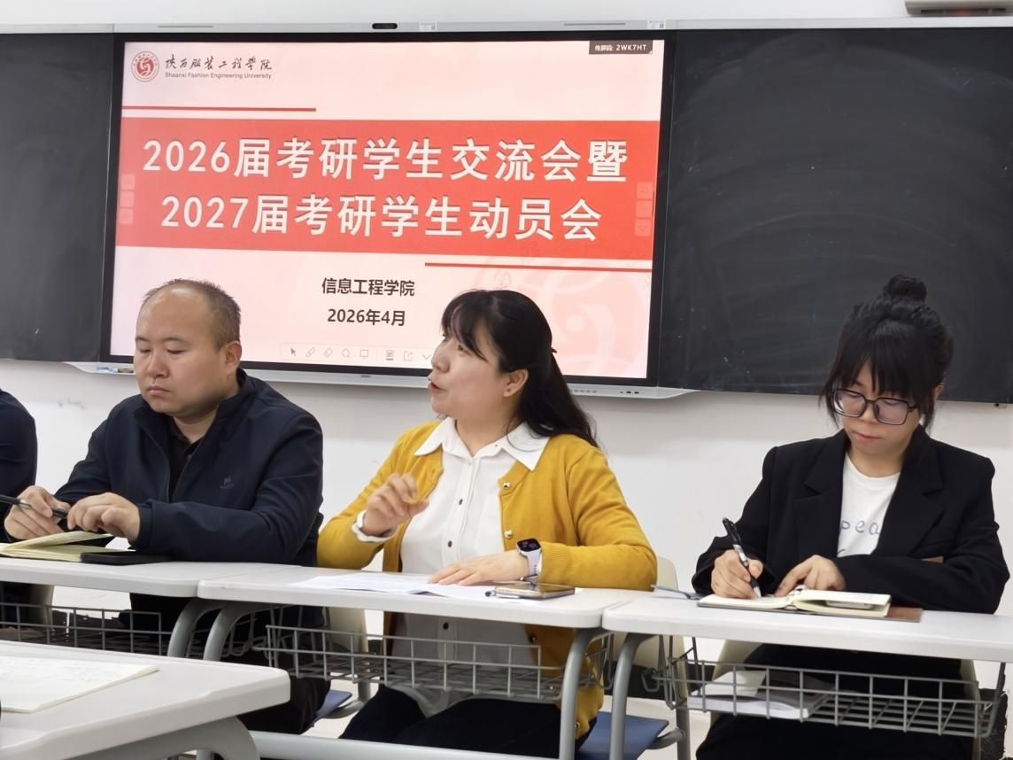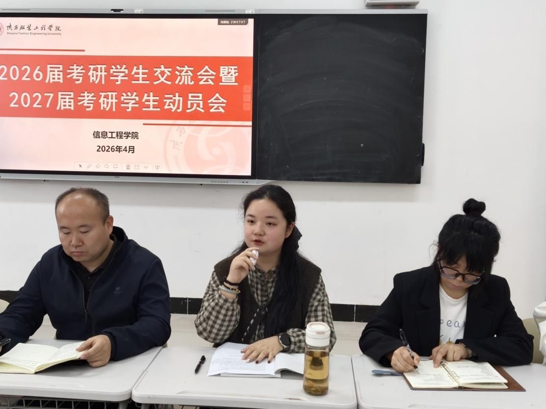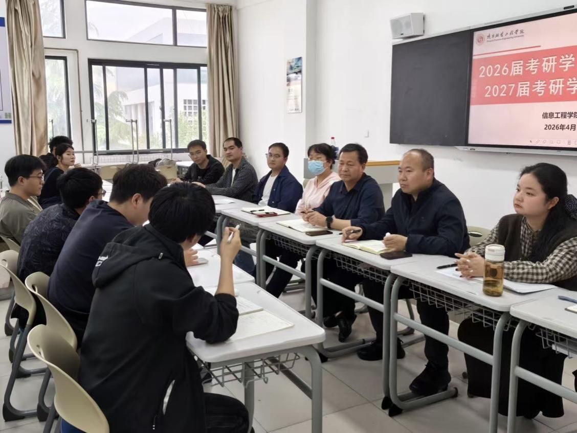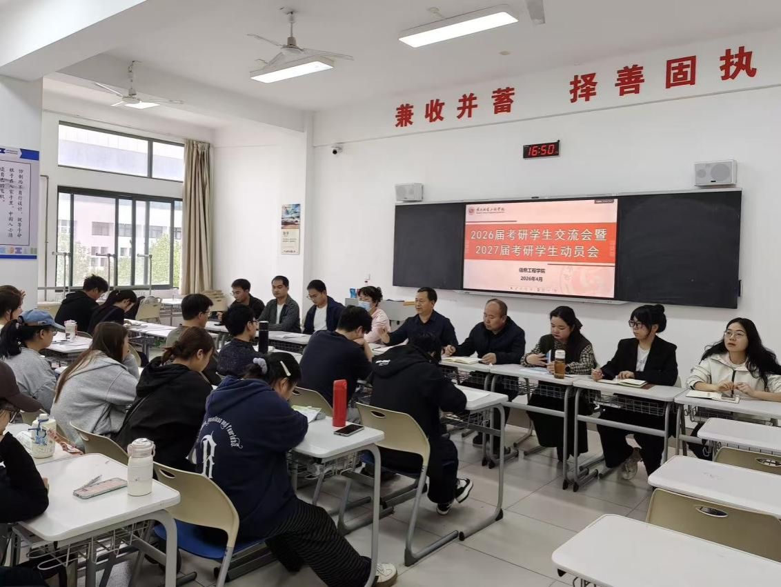 2026年4月15日,信息工程学院召开2026届考研学生交流会暨2027届考研学生动员会。学院党委书记、院长李水泉,副院长付向艳,学工办主任罗雄,各专业系主任、辅导员代表、2026届考研上岸学生及2027届备考学生参加本次活动。